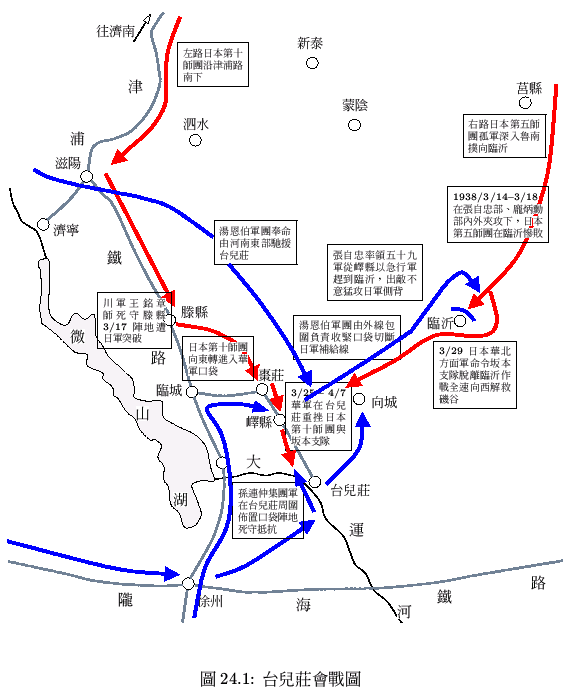 而华中派遣军则负责由南向北进攻,第十三与第九师团强渡淮河,北攻徐州, 主力是指向经由宿县,而扑向徐州西方的陇海铁路要站砀山,准备和华北方面军 的主力在此会师,以达成切断华军西撤通路、在徐州附近围歼大量华军的战略目 标,而华中派遣军为了争功,特别又增派第三师团以及两个支队北上,直逼徐州 ,此外,日军又出动陆战队在登陆连云港,日军对於徐州,进行了三面包围,并 且急攻徐州的西部,日军的作战计划是非常的明显,就是要以南北夹击的作战方 式,将作战的重点放在截断华军与西方连络的交通补给线,然后在徐州西方,成 功的围歼蒋介石刚刚完成整补的华军。